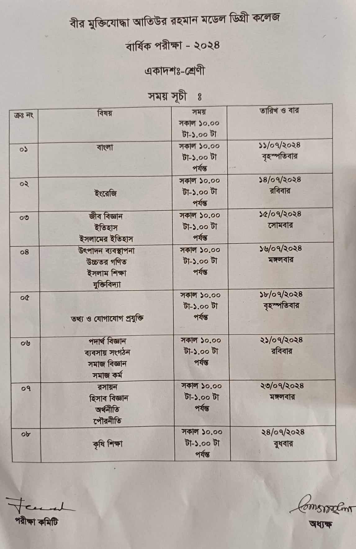 একাদশ ও দ্বাদশ শ্রেণির ক্লাস রুটিন